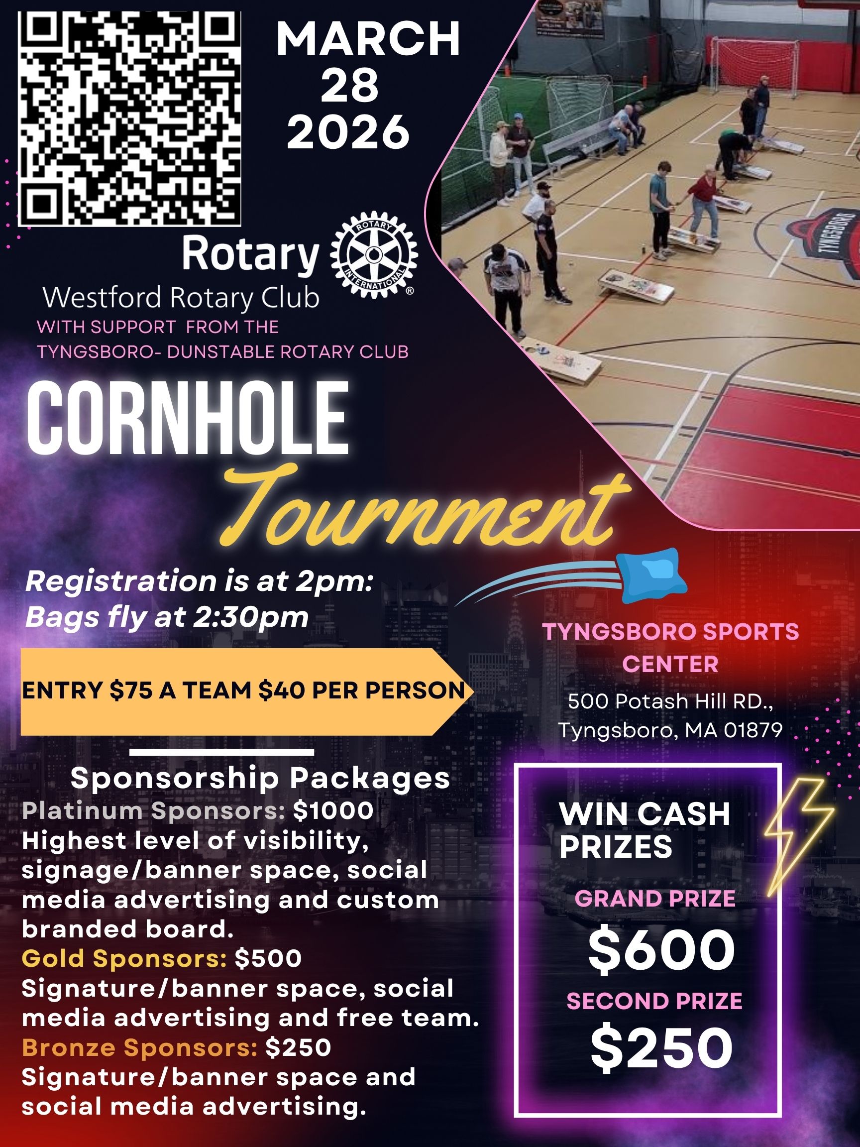 The cornhole date is set for March 28th . We have the court at Tyngsboro sports center from 1:00pm-8:00pm. The set-up will be from 1:00pm-2:00pm. Registration will start at 2:00pm and the event will start/bags fly at 2:30pm. The complete flyer is posted below.